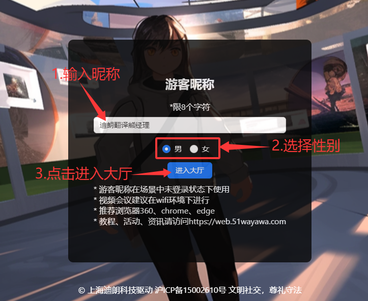 第二步: 输入昵称,选择性别,最后点击“进入大厅”按钮