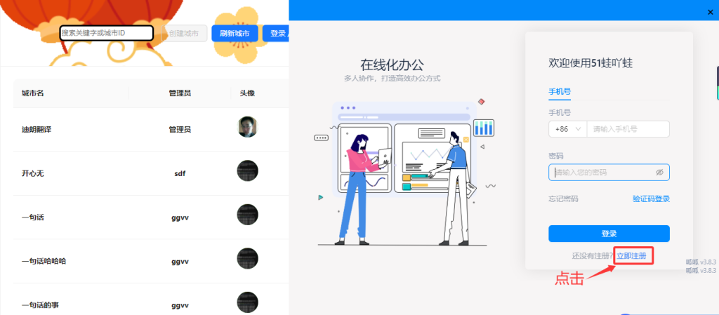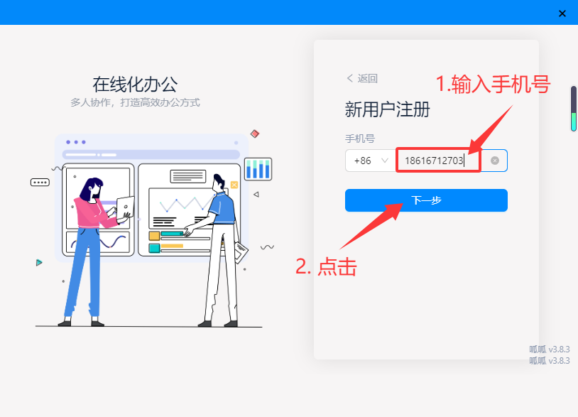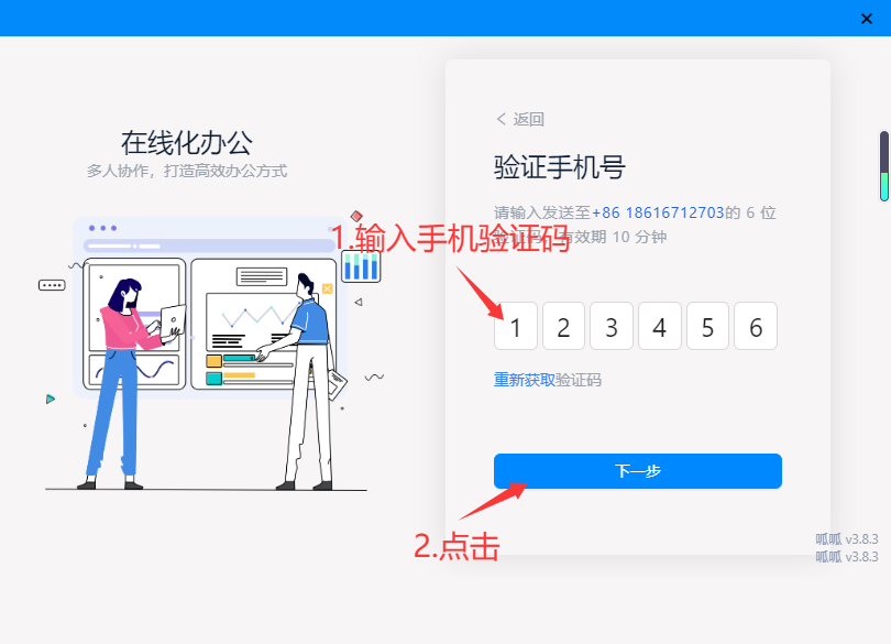第八步:1.输入刚才注册成功的手机号,2. 输入密码,3. 点击登录按钮。登录成功后,4.点击“x”按钮关闭窗口