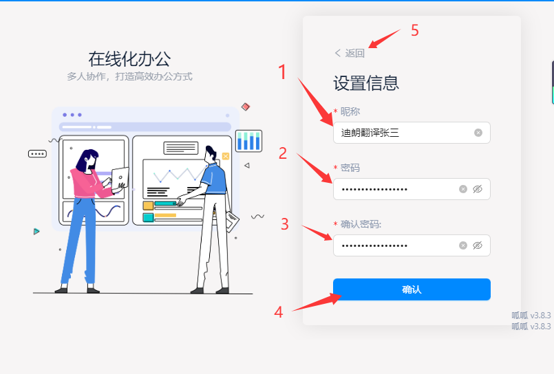 第七步:1.输入昵称 2.输入密码 3.输入确认密码 4.点击“确认”按钮。注册成功后,5. 点击“返回”按钮